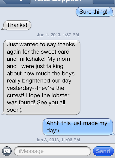Few things in life can make your day like someone telling you that your child made them smile. The other day one of our go to babysitters came over to watch the boys. She was rather blue when she walked in and told me that they had to put their 16 year old dog to sleep the night before. As I walked out the door I crossed my fingers that the boys would not be a handful and that she would not have to add stress to her sadness. Imagine my happiness when this message came through on my phone: